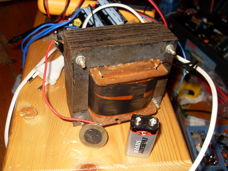 4 egyforma szekunder van rajta. Mindjárt megpróbálok méricskézni. Egyébként ennyi vaslemezt is alig bírtam bekalapálni a csévetestbe. Szóval 10,5 cm magas és 3,5 cm széles a vasmag. Itt egy kép, viszonyításnak. |