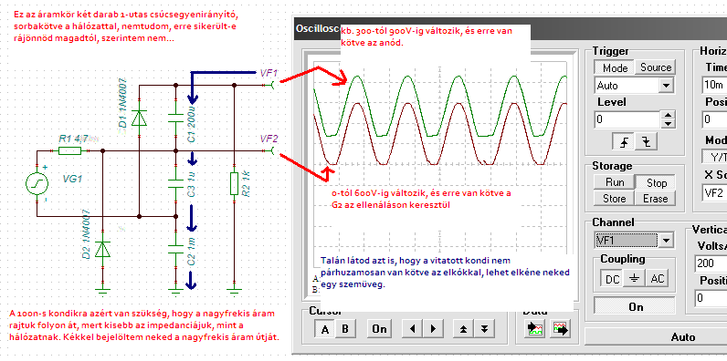Idézet: „közvetlen párhuzamos kötésben lévő kis kapacitású kondira is” Kezdjük azzal hogy nem a kis kapacitás, hanem a kis impedancia a lényeges, de tudom hogy sejtésed sincs arról, hogy mi az... Idézet: „És a kellő szűrés nélkül pedig nagyon tudnak ám melegedni,még ha te el sem hiszed.” Ember, olvasni tudsz? Írtam én olyat hogy: Nem az elkók sose tudnak melegedni. Nem. Persze hogy melegednek a nagyfrekis áramtól, de gondolom gőzöd sincs miért. Azért mert az átfolyó nagyfrekis áram szempontjából a skin hatás miatt megnő az ESR-jük. De akkor nézzük már meg azt is, hogy mi is az a párhuzamos kapcsolás: Két alkatrész kivezetéseit ugyanarra a potenciálra kapcsolod. Vagyis összekötöd egymással két-két kivezetését. Na most kérlek nézd meg azt a rajzot okostóni, és állapísd meg hogy a 100n-s kondik nincsenek párhuzamosan kötve az elkókkal. (a 100n-s kondik a hálózattal vannak párhuzamosan kötve) Idézet: „Nem is kell itt semmit elemeznem,mivel megépítettem ezt a kapcsolást,és gyakorlati úton jöttem rá a működési elvére.” Úgynézki tévesen jöttél rá, vagy meg se építetted. Lásd: Melléklet Üdv: