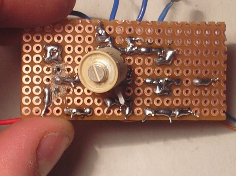 Az oszcillátor kábé ehhez a kapcsoláshoz hasonlít, bár a mostani jóval szűkösebben van összerakva és a "végfokban" a forrpontok körül ilyen árnyéksapkák vannak.