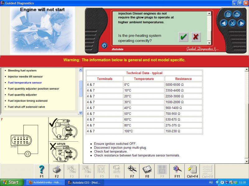 Szia! A vezérlőjéről nincs semmi információ, mert összetettebb mint azt meg lehessen rajzon mutatni. Értékek viszont vannak. Az izzítógyertyák 0.2-0.4ohm értékűek, a porlasztók pedig 80-120ohm értéket kell, hogy mutasson méréskor. A gázolaj hőfokmérséklet szenzor értékei a táblázatban vannak. Ha volna még valami ami a segítségedre lehetne és van róla adat, azt szívesen kikeresem és felrakom.