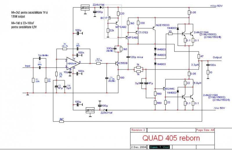 Az A osztályú vég/meghajtó alsó tranyója 50mA körüli áramgenerátornak van felépítve, azonban a felső oldali tranyó áramát is megfoga ugyanúgy 50mA-es áramnál - ezt így elég érdekes lenne kivezérelni. Az IC utáni kaszkád kapcsolás pedig gyakorlatilag felesleges, mivel nem nagyjelű módban megy a tranyó. Az eredeti (többszörös darlington kapcsolás szerü) megoldás sokkal jobb. Egy módosítás céljának nem csak annak kellene lennie, hogy más legyen az áramkör, hanem valamilyen szempontból legyen jobb, pl.: hangminőság, ár, megbízhatóság, stb.... Ezen felül a zárlat védelem elhagyását sem tartom jó ötletnek. A quad-nak ez a része az eredetiben kimondottan jól volt megoldva, és jól is működött, ráadásul csak filléres többletköltséggel jár a beépítése. Idézet: „Találtam egy külföldi fórumon” Ez mindent elmond !
