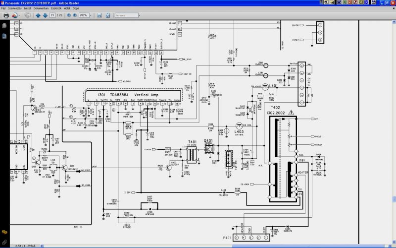 A rajz szerint nagyon sok minden megy arról a 12,6V-ról.Video proci,meg valami central control unit,és a képcsőnyakán van egy panel,még egy ic-vel oda is megy.Mindenhol megtudtuk mérni külső tápról,az LM317T megkapja a 18V-ot,de a terhelés miatt nem adja ki a 12,6-ot.Hát passz...SMD tranyókat is néztük,ami a körbe van,de miután beindult,és lila lett a kép,meg pattogott a képcső,ott vége lett a kísérletezésnek.Ami melegedett az a central control IC. Üdv: AttilaBővebben: Link