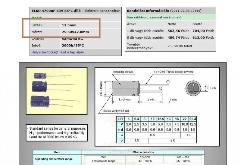 Bővebben: Link Meg tudná nekem valaki mondani az adatok alapján, hogy egy 4700µF-os kondenzátor, ami 63V-ra van, az milyen geometriai paraméterekkel rendelkezik? Fontos lenne a kondenzátor átmérője és a lábak közötti távolság. Érdekelne az is, hogy a megadott adatokból, hogyan lehet kiszámolni, mert egy ideig nézegettem, de én nem jöttem rá... Köszönöm!