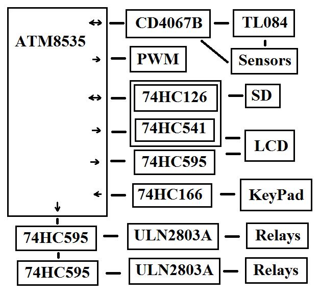Egy régi tervemhez kérnék tőletek segítséget. A koncepció már régóta létezik bennem és már több tervet is készítettem, ám mindig közbejött valami, ami miatt félbe kellet hagynom. Megpróbálom érthetően összefoglalni: AquaController 1 ábra – aquacontroller 2011 A vezérlő alapja egy AVR mikrovezérlő, pontosabban az ATMEGA8535. A feladatai: - idő kiírása 00:00:00 hh:min:sec ill a nap kiírása is (Mo Tu Th…) - 8db relé vezérlése 74HC595ös shift-regiszteren keresztül - egy 128x64 pixeles LCD meghajtása (BG12864D) (ahogy elképzeltem: Display.jpg) - reléként legalább 2-2 be és kikapcsolási időpont megjegyzése (naponta) (6:00 be, 11:00 ki, 12:00 be, 20:00 ki) - szenzorok(hőmérséklet) értékének kiírása LCDre - mért hőmérsékleti értékekre automatikus reagálás (hűtés fűtés vezérlése, relé ki és bekapcsolásával) - adatok (melyik relét mikor kapcsolja be és ki vagy milyen hőmérséklet mellett) bevitele KeyPaden keresztül Későbbiekben: - PWMen keresztüli peltier-elem tápellátás (buck-boost converterrel 12V15V) - SD-kártyára történő adatmentés Kérdések: A szenzorok és az ADC bemenet közé kell e egy jel erősítő OP-AMP (TL084)? Milyen szenzort javasoltok hőmérséklet érzékelésére (10-40fok)? Fel/lehúzó ellenállások hova kellenek, ha kell? Minimum milyen vastag(széles) vezetősáv kell 230ACV (5A) mellett a nyákon a relékhez? A peltierhez tartozó relék megvédésére, pontosabban a rövidzár elkerülésére, alkalmas e ez az áramkör? ábra 2. – peltier signal protect 74HC86os XOR kapui és 2db dióda felhasználásával igaz e a kapcsolásra az alábbi táblázat: Abe Bbe Aki Bki 0 0 0 0 1 0 1 0 0 1 0 1 1 1 0 0 Elsőre ennyi. SB