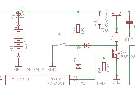 Az automatikus kikapcsoló áramköri rész az eredeti rajzon szerintem egy kicsit nyakatekert, a LED is ezért világít halványan. Én másképpen, talán egyszerűbben, de mindenképpen megbízhatóbban oldottam meg ezt. Mellékelek egy kis részletet egy gyártásban levő áramkörömből, amin jól látszik a ki/be kapcsoló. Szerencsére a szoftveren semmit nem kell varázsolni, mert a jelszintek éppen jók, csak a megfelelő portokra kell kötni a 2 lábat. Egyik az öntartás, ami 1-ben van, amíg bekapcsolva tart, a másik a nyomógombtól jön, ami ha 0-át kap, indítja a tápellátást és a uC-nek is indító jelet ad. Én manapság már a PNP tranzisztor helyett is PFET-et használok, sőt találtam a l@mexben egy un. Load Switch áramkört, ami ide ideális, bár smd tokban van. (FDC6324L Load Switch 20V/1.5A Supersot-6). Ezzel a fogyasztás még kisebb lehet. Stab IC-nek pedig mindenképpen a LDO-t javasolok. Esetleg itt is szóba jöhet egy Step-Up . Ekkor mehetne 2 ceruza elemről/akkuról. Talán ez a mérőkör nem annyira érzékeny a kapcsitápra, mint az LCM3. Bekapcsolást jelző LED-et például tehettek az 5V-os stab bemenetére, bár szerintem elemes készüléknél nem feltétlen kell, hiszen ott az LCD, ami úgyis kijelez valamit, ha be van kapcsolva az áramkör.