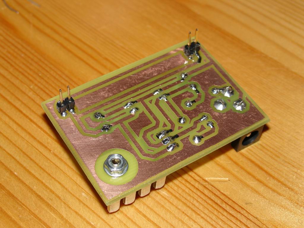 Igen, először vágtam a panelt, és utána vasaltam, sajnos kicsit el is csúszott, bár ez nem befolyásolja. Az egyik ellenállás kb. 1mm-el lóg ki, a kondit meg direkt hajtottam ki, mert nagy volt, és hogy messzebb legyen a nagy ellenállástól. Jobb lett volna egy 4700/16V, szerintem annak lett tervezve a hely, utólag vettem észre.
