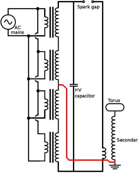 A szekunderköri föld az teljesen különálló kell, hogy legyen! Külön kell valami nagy felületű kábelen a legrövidebb úton a földbe vezetni. Egy kemény rézcsövet leütsz a földbe 30 centi mélyen, az lesz a szekunder oldali földpontod. A trafókat teljesen olajba kell meríteni (mi értelme lenne félig tölteni?). Forgó szikraköznek legalább 800bps-t kell tudnia, hogy tudd hangolni.