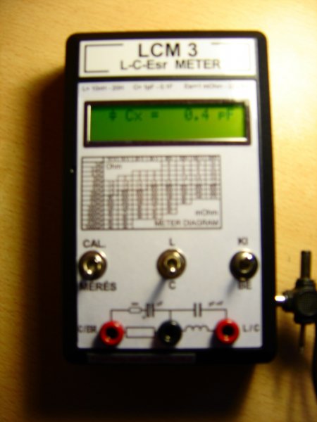Megépítettem az LCM 3-at ,leírom a tapasztalatokat. Az élesztés során elsőre nem indult mert C5 kondi zárlatos volt,miután kicseréltem minden működött(V1.24). Sajnos történt egy baleset , az l/C bemenet mérőcsipesze hozzá ért a négyágu tápdugóhoz és meghalt a PIC műveleti erősítője (a program működött a Pic-be , de az oszcilátor nem rezgett). PIC csere után ismét feléledt .de ESR-t csak 15Ω-ig mér(előző PIC-kel 30Ω felett volt) Uesr = 108mV ,a tekercset átraktam a foorasztási oldalra így 117mV lett! A Ccal értékét pontosítani kellet(nyomogombos álítás) ,de kikapcsolás után elfeljti(V1.24 programhiba !?), V1.2-1.22 jó A jó sorrend: 1; rádug 2; átvált 3; beállít 4; lehúz 5; visszavált Fo =496,5kHz Fcal =352,8kHz Re =0,240kΩ Uesr=117mV Fesr=83,3kHz In circuit mérőfeltét jól működik(Uesr=10mV) Megkérem a szerzőt hogy a V 1.24 Prg. javítását tegye fel ! Egyépként gratulálok a szerzőknek a remek műszerért! Üdv.:Nagy G.