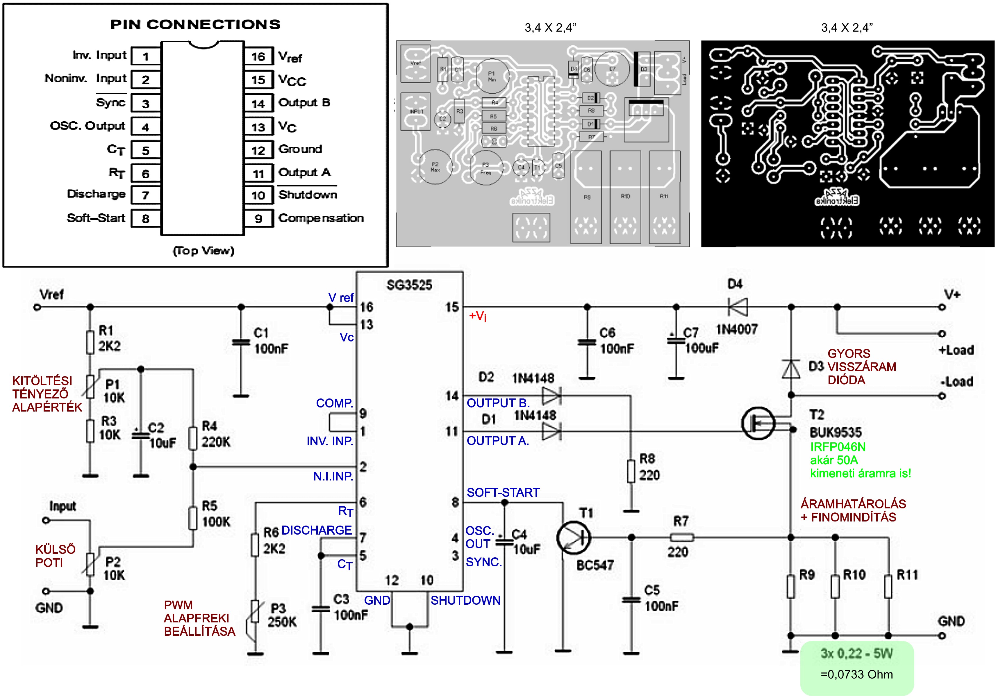 Én nem ezzel az IC-vel építettem meg, hanem ennek a testvérével, a SG3524-es típussal, szinte ugyan az, csak més a lábkiosztása. Ebből a szempontból mindegy. A frekvenciát nem "kell" valamilyen értékre állítani, az attól függ, hogy mit raksz rá terhelésnek. A motorok önindukciójától, nagyságától, stb. függ, hogy milyen frekvenciát "szeretnek", vagy nem. Vannak olyan motork, amik kimondottan az alacsonyabb frekit szeretik, bár jellemző módon ilyenkor hallani is a PWM működéséből eredően a hangot, vannak magasabb frekin működő motorok is, de sajnos nem lehet egyértelműen azt mondani, hogy pl. 1KHz, vagy 300 Hz, azt sajna ki kell kísérletezni. A fontos az, hogy ne forraljad fel a FET-et a kimeneten, egyébként a motor leadott teljesítményéből is lehet arra következtetni, hogy alacsonyabb frekin ad e le nagyobb teljesítményt, vagy magasabban. Ezért jó, ha a PWM frekijét viszonylag tág határok között lehet szabályozni. A feltüntetett alkatrész értékekkel tudja ezeket a határokat. Az eredeti kapcsolás azt hiszem 6,5 A maximumot tud, de azt is csak a FET miatt adják meg, mert kisebb teljesítményű, mint amit javasoltan 50A értékhez. Azt az ellenállást is ki kell ilyenkor cserélni kisebbre, ami a FET "S" lábáról megy a föld felé, mert ha eléri rajta a feszültség a 0,2V (200mV) értéket, akkor a kimenetet letiltja, így korlátozza az áramot. De pontosabban nem egészen tiltja le, hanem befolyásolja a kimenő impulzus szélességét, annyira csökkenti, hogy ne tudjon nagyobb áram folyni. Üdvözlettel: patkolttojas