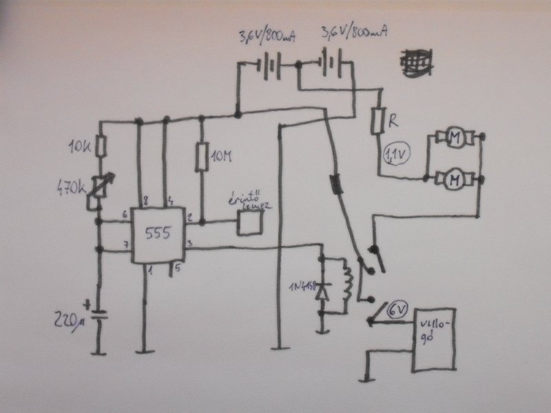 2 áramkör lesz indítva a reléről.Az egyik áramkör 2db 1,5V-os motorból áll(1,1V),a másik pedig egy egy ledes vibrálva villogó(6V).Az időzítő pedig ami a relét kapcsolja,egy érintőlemezes 555-ös időzítő.Ide kell a 7,2V (2db 3,6V/800mA,hogy mindent bírjon).