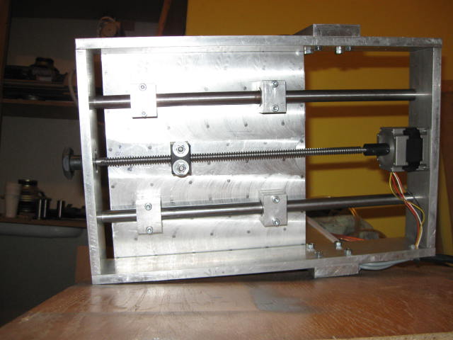 Csináltam pár képet a kicsi gépröl 160x160x80mm a munkaterület . Az "X" tengely 10mm-es lincsapágy golyospersellyel . Az "Y" tengely 12mm-es lincsapágy golyospersellyel . 10x3mm trapézmenetes orso és POM anya mindenhol . Az alap váz 10mm vastag AlMg3 lemez az "X" tartolábak 6mm vastag aluminium lemez . A föorsolya nagyfordulatu Brussles motor ( alap fordulat 55 000 ) a hütése a legnagyobb gond . Kissebb aluminium ( más moromotorral ) és müanyag munkákra de föleg nyák marásra és furásra szánom . 6560AHQ mikrolépéses vezérlö LPT leválaszto kártyával lessz az elektronikája .
