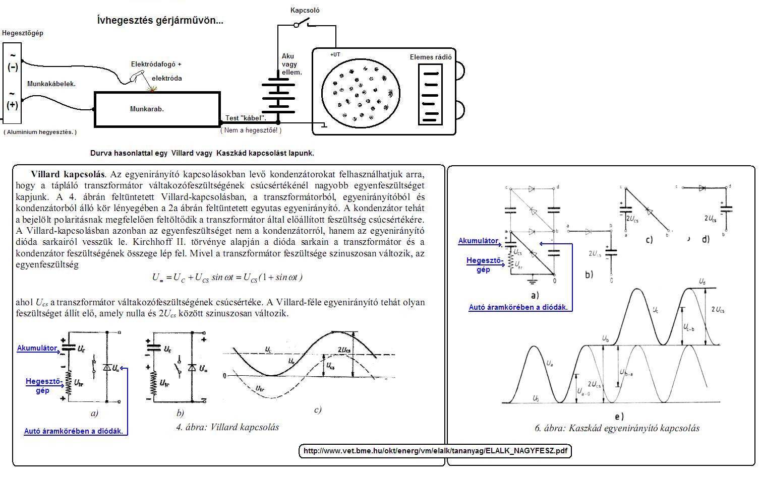 Adott egy olcsó telepes rádió. ( Ez akár egy kidobásra ítélt példány is lehet. Ami legalább egy állomás vételére még alkalmas, és nem kár érte ha tönkremegy. ) Kell egy munkadarab a hegesztéshez. ( Tetszőleges. ) Kell még egy vastag vezető aminek az egyik végét rögzíteni kell a munkadarabon. A rögzítés fix elektromos kapcsolat legyen. A vastag vezeték másik pontját a rádió test pontjára kell kötni. Lásd a mellékelt rajzon. Kell egy hegesztő gép. ( S minden ami a hegesztéshez kell. ) Durva hasonlattal egy _Villard_vagy_Kaszkád_ kapcsolást kapunk. . 1: A rádió legyen kikapcsolva. Az elem csak a rádiókészülék test pontján csatlakozzon az áramkörhöz. S mehet a hegesztés. 2: A rádió legyen bekapcsolva. Az elem mindkét pontján csatlakozzon az áramkörhöz. A rádió üzemel. S mehet a hegesztés. . De lehet csak nagyon kipihentem magam. :hide: