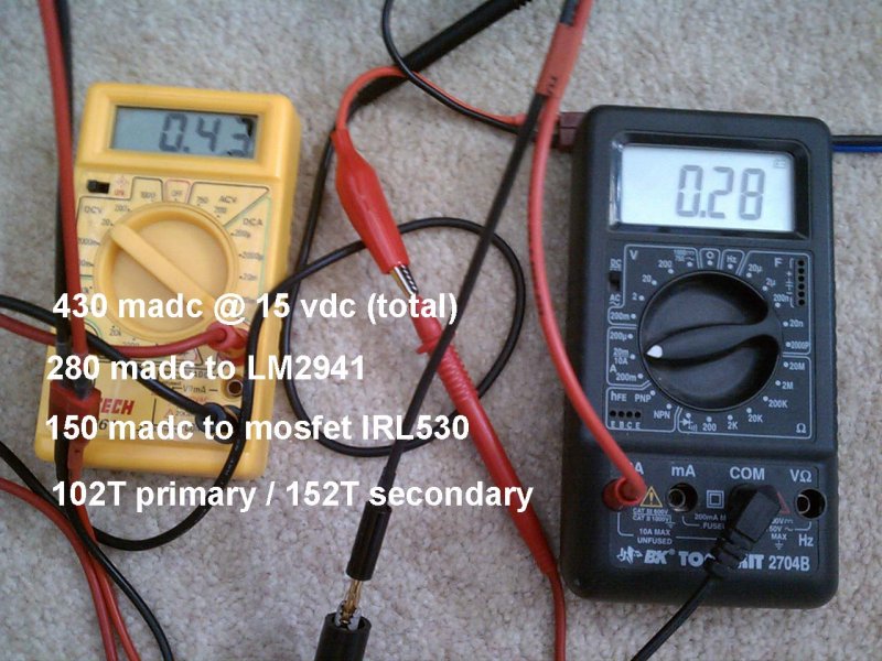 Mértem a jelenlegi szolgáltatott a 15 VDC szabályozott szolgáltatói @ 430 madc, az alapegység. Ez teljes áram. Én mért áram LM2941 @ 380 madc. Tudom kiszámolni, hogy 150 madc megy át a primer tekercs. Azt is hiszem el. Semmi sem lesz meleg.