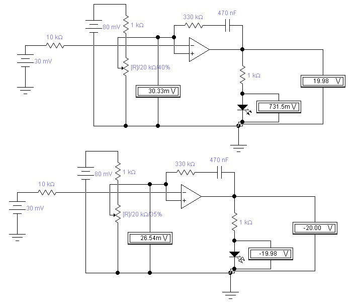 Azt hiszem, ráéreztem. Ebből indulj ki szerintem. Ha LM358-at használsz, és GND és 12V lesz a tápja, akkor GND-re fog kiülni a kimenet, ha kisebb a mérendő jel, mint 30mV. Ha nagyobb, akkor pedig 12V-ra. A 80mV-os elem helyére kell a mérendő feszültség, a 30mV-ot pedig valahogy előállítod. Pl. Tl431 és feszültségosztó, vagy 7805 és feszültség osztó, vagy ahogyan kedved van!