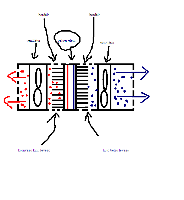 Az egeszrol mellékeltem egy skiccet, eleg bena, de latszik, hogy egy 40x40 es belso keresztmetszetű, 2 végén nyitott, oldalt a beáramlo levegőnek felsliccelt dobozba tenném. (tölgyfából, ahogy az egész hűtő is abból lesz. a hütütt teret a fütöttöl a peltier elem valasztana el.