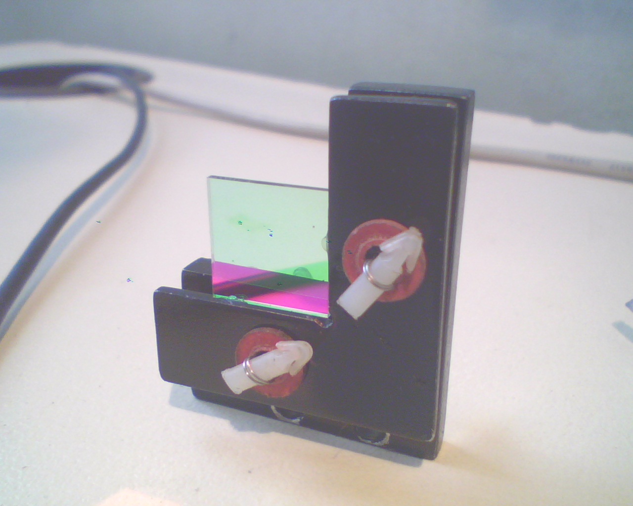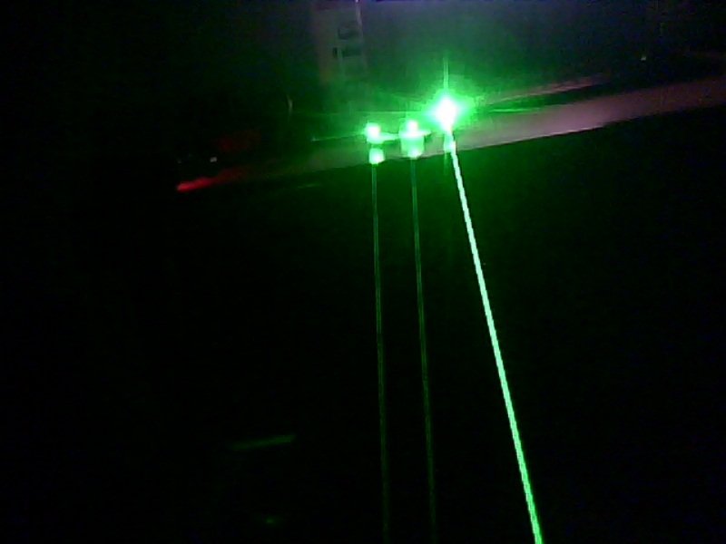 Bal oldalt és középen a dichrókon áthaladó és azokról visszavert sugarak,jobb oldalt a fényes sugár pedig egy felületi tükörrel van visszaverve. A kép füstben készült,mert anélkül nem lehet látni a dichrókon kisszaverődő sugarakat.(a kép sajnos nem lett a legjobb) Ennyit a hatásfokról A kéket(lilát) pedig gyakorlatilag 99% tükrözi,semmit nem ereszt át.A vörös szinnél pedig ugyanaz,mint a zöldnél,csak forditva,nagyon keveset ereszt át. Ezekről kép még nem készült.