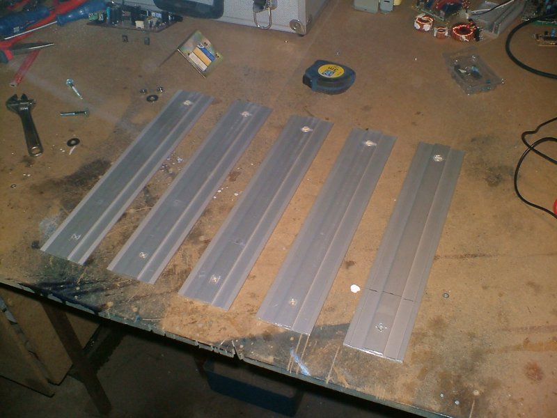Megrendeltem a TDA2050-hez a "kütyüket", de érkezésig sem szerettem volna semmit tenni, ezért megcsináltam az erölködő hűtőbordázatát, ami a csatolt képen láthattok. Nem akartam pénz kiadni a hűtőbordára, ezért körbenéztem a "kincsesbarlangban" a műhelyemben. Anno felújíás után maradt eloxált alumínium köszöbléc. Hát ebből lesz a hűtőborda. A bordák közötti részt WD40-el fújtam le "bőséggel", hogy jó legyen a thermikus kontakt a lemezek között. Alább a végeredmény!