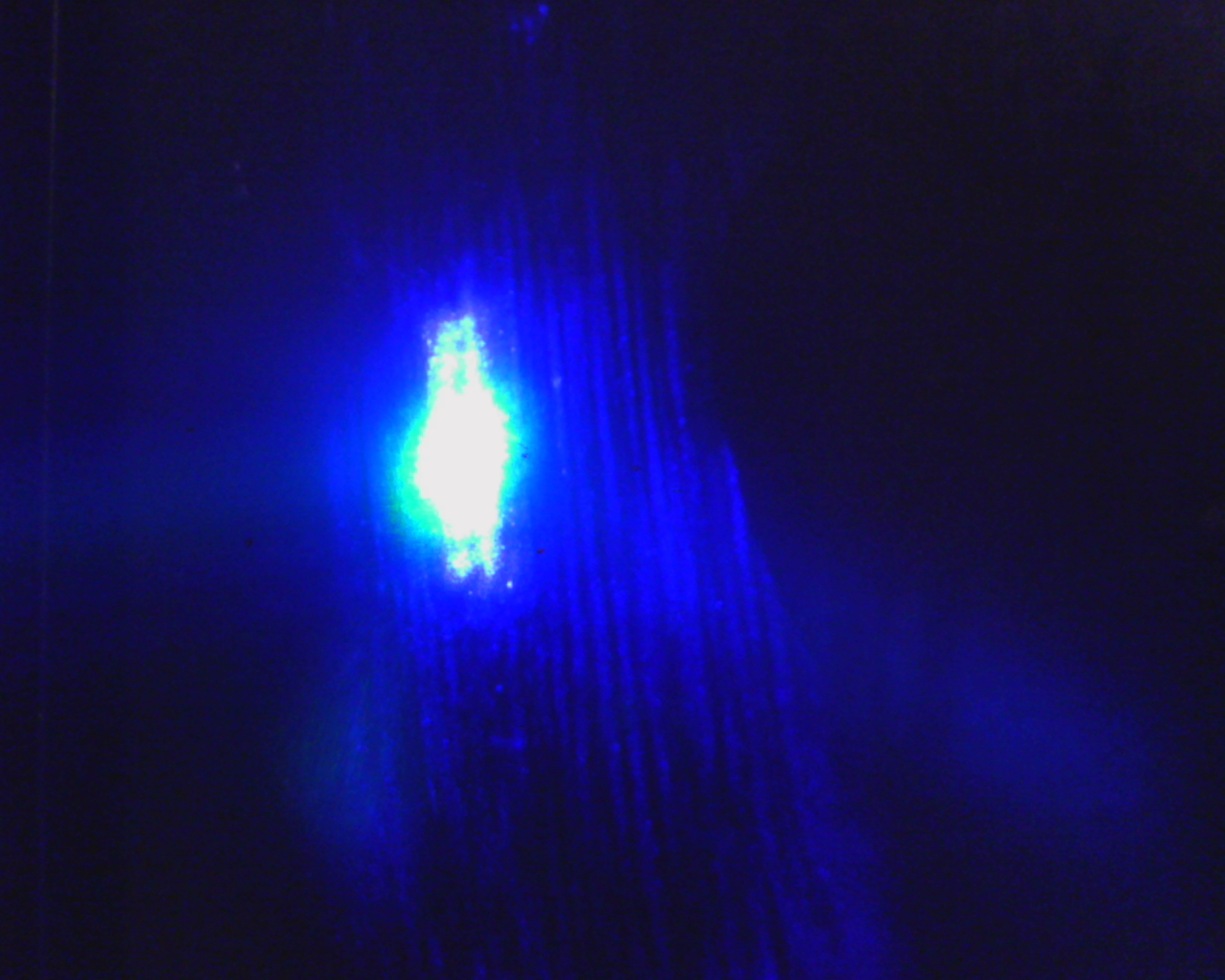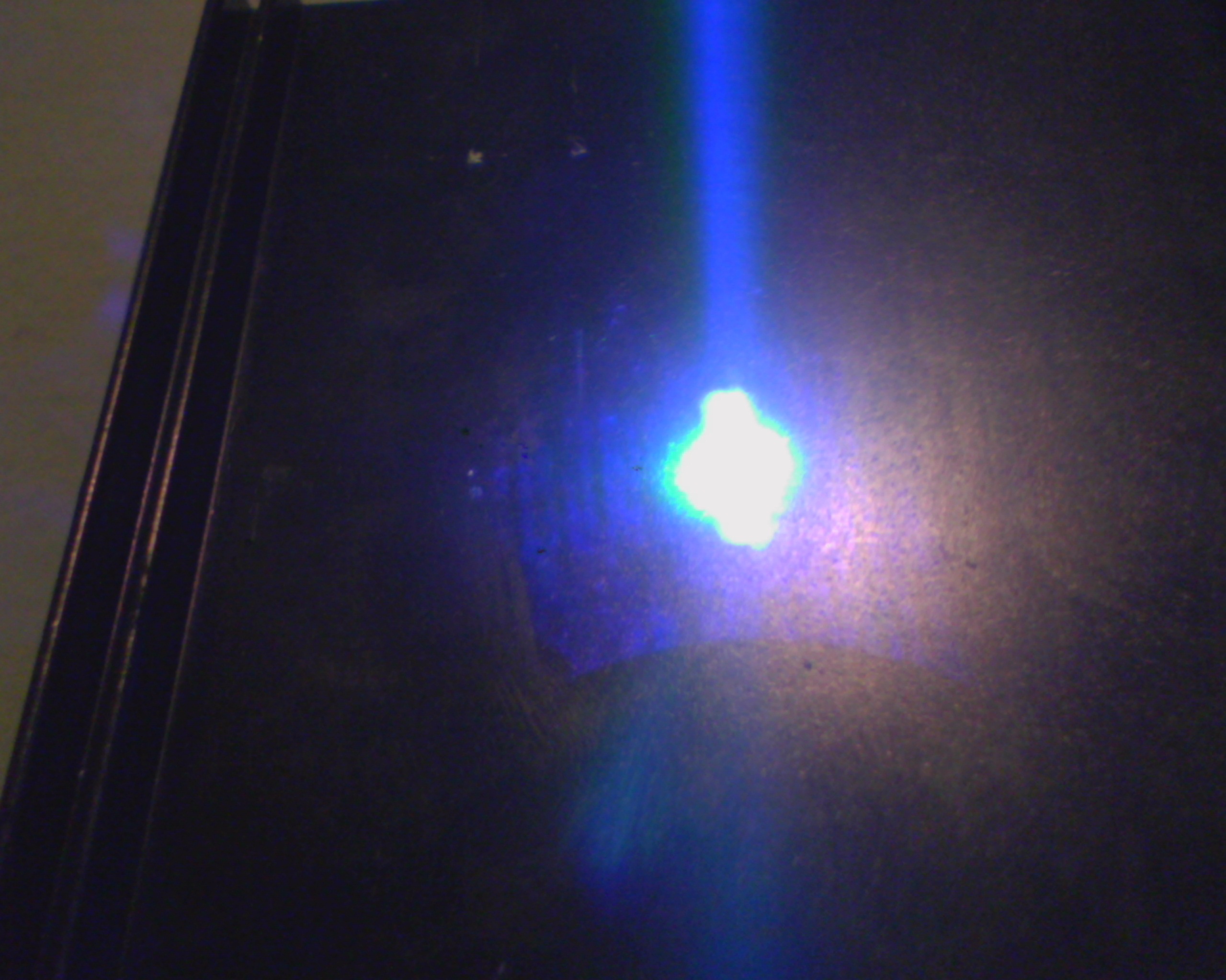 A kék a függőleges csik szerű valami,a kerek kis "paca" pedig a zöld lézerem profilja. A sugarat egy tükörrel vertem vissza,az igy keletkező távolság 10 méter.Messzebre sem változik az összetett profil,csak növekszik kissé az átmérő Sajnos elfelejtettem egy mérőlécet tenni mellé,de szemre nagyjából 6mm átmérőjű volt,ezen a 10 méteren. Maga sugár szemből egész szép hideg fényű(de ez nem jelenti azt hogy meg ne égetne,mert átkozott meleg)a kék nem túlzottan lóg ki,sikerült elég jól beállitanom a kis akryl lencsét. Scannelésnél,animálásnál pedig ezt a kis hibát gyakorlatilag nem lehet észre venni.Erre bizonyiték egy videóm ,1 hónappal ezelőtt készült,akkor még DVD dichrókkal