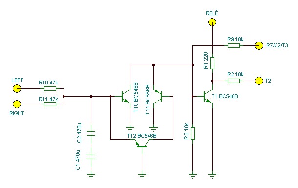Ugyanis ha az AMP pontokra rákötöd az erősítő kimenetét, akkor az AMP pont GND -re kerül, ezért a fentebb írt kör feszültségosztóként működik. Ezt az osztókört kell átméretezni, figyelembe véve a két időzítő kör időállandóját. (Egyik a bekapcsolási késleltetés a C2 elkóval, a másik meg a bemenőkör integrátora a C3 elkóval)