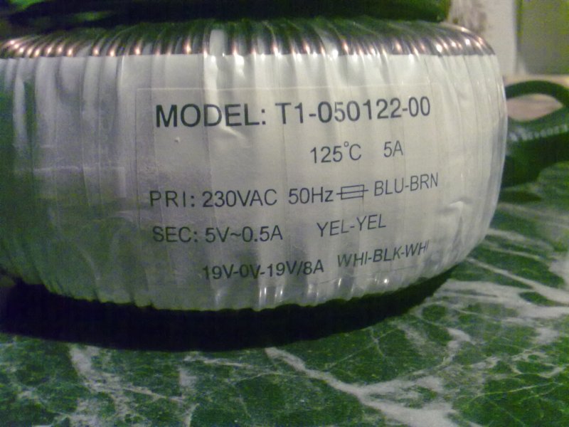 Ez a trafó egy 5.1-es erősítőből van. 19v 8A van ráírva, és még valami kissebb kivezetése is van, ha jól emlékszem 5v 0.5A. Van rajta egy nyáklap csatlakoztatva egy kis hűtőbordával amin van két alkatrész és mellette egy 10000uf kondi. (Gondolom ez az egyenirányító).