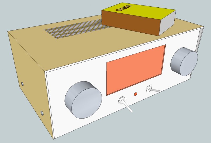 Pénz és alkatrész hiányában nem nagyon haladok a mini erősítőm építésével, de azért egy grafikát tudtam készíteni, hogy miként fog kinézni. A gyufásdobozt csak a méret szemléltetése végett rajzoltam oda.