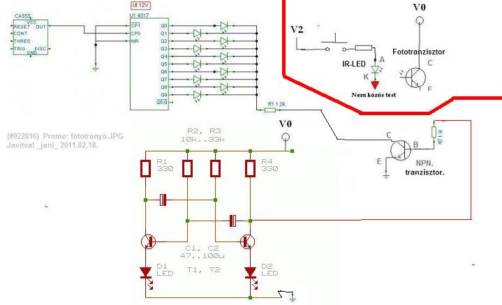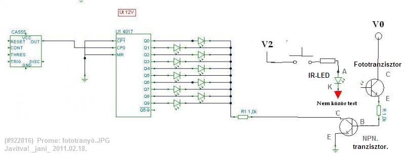 1: Az IR-led jelölése megegyezik a hagyományos LED jelölésével. 2: Az NPN-es fototranzisztornak és a bipoláris NPN-es tranzisztorok Emittere a - UT fele álljon. Mert csak úgy működik jól. 3: A bázis áramot illik ellenállással korlátozni. Mellékelem a javított rajzot. A 4017-es kimenetére kötött LED-ek csak akkor világítanak, ha a fototranzisztor fényt kap. Vagyis ha az IR-LED, vagy külső fény azt megvilágítja.