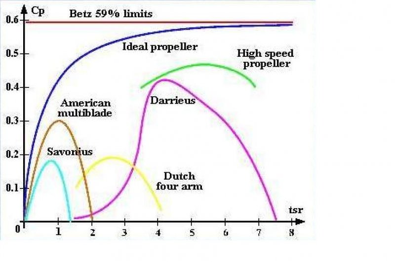 Az általad feltett grafikonon is jól látszik, hogy minden szélkerék típus csak egy bizonyos tsr tartományban használható, és minél gyorsabb járású (nagyobb tsr), annál jobb az elérhető max. hatásfok!