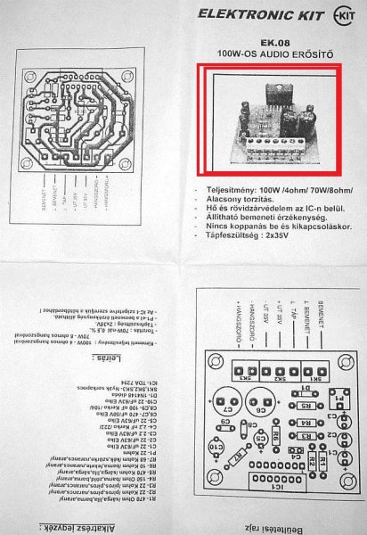 Mivel nem vasalással nyomtam rá, a nyák rajzot,hanem berajzoltam Linkeltem az eredeti KIT képet amit Pirossal be kereteztem azt nézd meg, meg az én általam készített erősítőt Fordítva van! a bemenet nálam a 13-as Lábnál van.... amikor a 3-as lábnál kellene lennie!! nekem ezt a NYÁKrajzot Linkeltem Tükröznöm kellet volna és úgy felrajzolni a nyáklapra!! És persze imádkozok ,hogy nem döglőt bele az IC