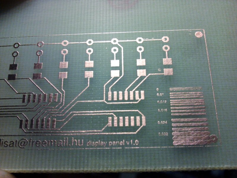 A 88-ik oldalig olvastam a fórumot, szóval nem tudom volt-e már róla szó, de nem kell erőltetni a műnyomót! Mezei 100g-os fénymásolópapír (ún. színes papír) nagyon jó eredményt produkált! A panelen szándékosan csináltam extra vékony vonalakat is, hogy lássam mit tud a technológia. Vaskloridot viszont vennem kellene, mert ez már nagyon öregecske. És az előmaratás a lényeg! Sokat szívtam, mire ezt kipróbáltam, és így viszont tökéletesen tapad a festék, alig bírtam ledörgölni! A legvékonyabb vezetéknél látszik hogy megszakadazodik, illetve a keretnél. Mondjuk megjegyzem használni akarom, nem rekordot dönteni