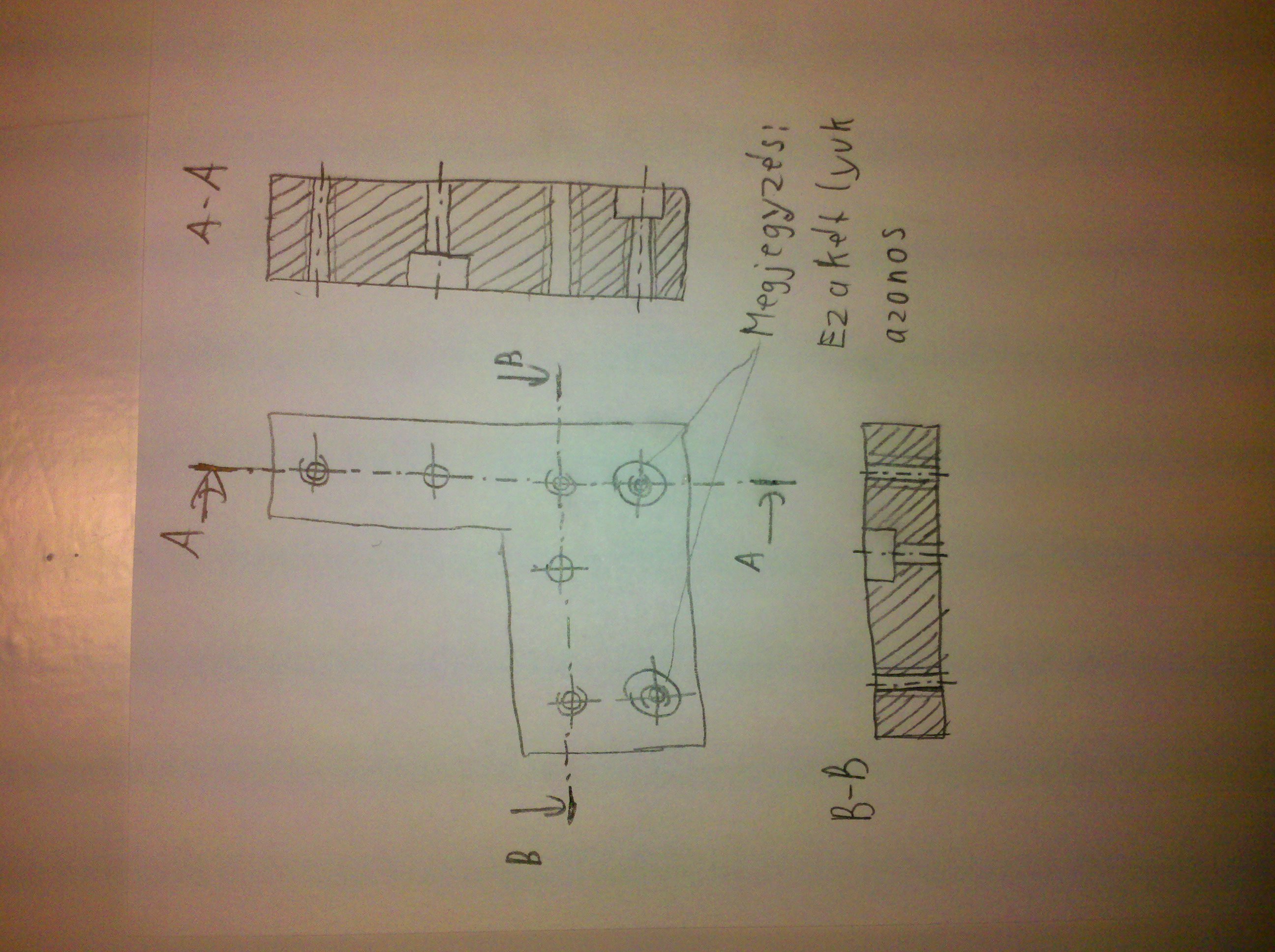 Ez alól kivétel, a nagyon közeli vonalak, a nem lényeges görbék pontos megszerkesztése (a tengelyre a hornyot mindig egyenesre rajzolod oldalról, nem pedig kicsit lejjebb, mint valóságban). No szóval, ha nem mén a dolog rendesen, akkor legyen sok rajz, de az egyértelmű. Rajzold meg a tárgy három nézetét. Majd ami ebből nem látszik, arra csinálj metszetet. A nézet elhagyható, ha a metszet megy helyette, és ebből is egyértelmű lesz. Viszont egy rajz nem lehet nézet és metszet is EGYBEN. Létezik részleges metszet, azt használhatod. A dichro tartó montírozott.PNG képeden a jobboldali rajz az egy nézet, melyre legalább két metszetet rárajzoltál. A mélyedést, ha látod, akkor körnek rajzolod, teljesnek. A menetet pedig egy kör és köré egy 3/4es körív, aminek kezdő és végpontja véletlenül se esik egybe a kör "tengelyvonalával". Majd mindjárt levázolom neked ezt az egy tárgyat, a többire gyere rá magadtól.