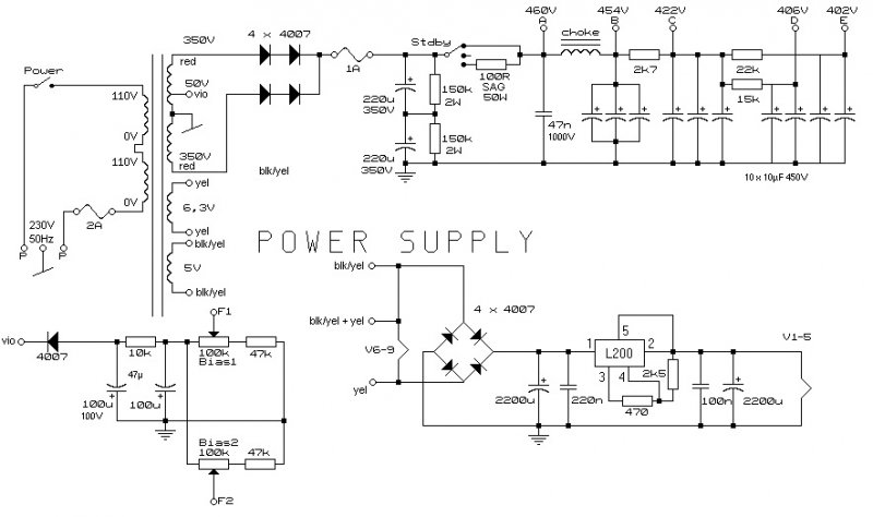 2 szekunder kivezetéssel is tudsz kétutas egyenirányítást csinálni, alias graetz híd. Semmit ne változtass, nem kell ebből rakéta tudományt csinálni, tényleg nem attól lesz dual recto hangod, mert a kapcsolás ugyanaz, ezt most elárulom, a kutya máshol van elásva a világ osztott paraméterben működik, nem koncentráltban. Azért van 2 dióda sorba kötve, mert a maximális feszültség tűrésük nem engedi meg, hogy 1-1 legyen, 2 között megoszlik a feszültség fele fele arányban. Párhuzamosan kötni nem célszerű őket, mondhatni kerülendő, sorosan midnen további nélkül. Ha kinézel olyan diódát, ami képes elviselni ezt a nagy feszültséget, kellő áramot is elbír, akkor egy is elegendő. Graetznél meg adott egy tokban a 4 dióda... A trafót meg nyugodtan kösd rá a hálózatra, miért lenne baja, aztán jó keresgélést, javaslom egy papírra felírni mi között mi van, szokott fejtörést okozni, de a legegyszerűbb az lenne, ha egyszerűen a donor cuccból lekövetnéd melyik hova ment...és akkor látnád melyi ka mnagyfesz, melyik a fűtés, melyik a bias...szerintem.