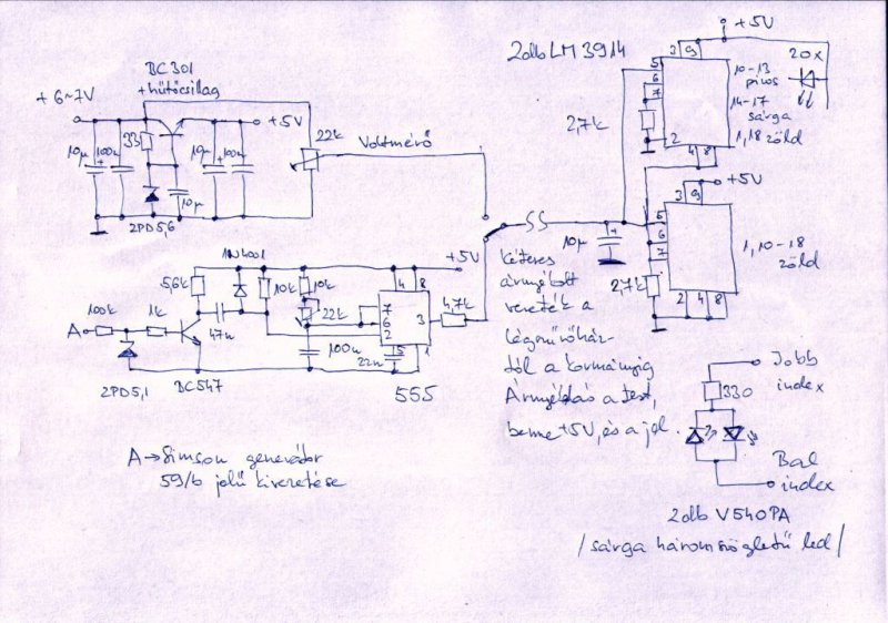 Az indexeim visszajelzését én is hasonlóképpen oldottam meg. CSak én 2db ellenállásal. A bal és a jobb indexnél egy-egy soros ellenállásal. Továbbá van tompított, reflektor és gyújtás visszajelzésem, szintén soros ellenállással, és leddel. Nekem is van akumlátor töltés visszajelzésem egy 2 színű közös anódos leddel, ami 4 állapotot tud visszajelezni. De a feszültségkijelződ praktikusabbnak tünik. Mingyárt áttanulmányozom, addigis mutatom képekben az én műveim. Továbbá készítettem már magamnak ledes hőfokmérőt is. Erről is van kép. Most egy 3-as óratartó van hozzájuk készülőben, hogy egyszerre tudjon minden menni.