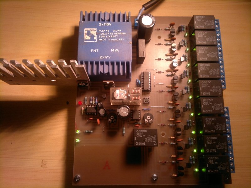 Működése mindössze annyi, hogy a fogyasztókat egy bizonyos időköz elteltével kapcsolja rá az agregátorra. Az időt potméterrel állíthatom. (kb. 2sec-90sec) Van benne még egy időzítő, ami a legelső rákapcsolás idejét állítja be. Holnap jöhet a lakkozás és a beépítés.