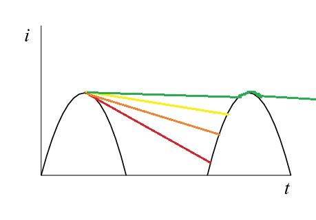 Probáld meg. Énis linkelek egy rajzot az ugyanz, de ezen talán érthetőbb. De a pufferelést ne sajnáld, mert ez így egyutas egyenírányítás lesz ahol, a bemeneti sinusos váltakozó feszültségednek csak az egyik félperiódusát tudod hasznosítani, tehát például a sinusjel felső púpját. Ezért ezt pufferkondi rengeteggel kell "kárpotolni" Csináltam egy rajzot, ami bemutatja amit írtam. Ideális esetben a zölldel rajzol vonal lenne a tökéletes, de ezt elérni nem egyszerű, ahhoz rengeteg pufferkondi kellene. A piros vonal az már nagyon rossz, ott már hallgathatatlan lenne az erősítő, akkorát esne a feszültség.