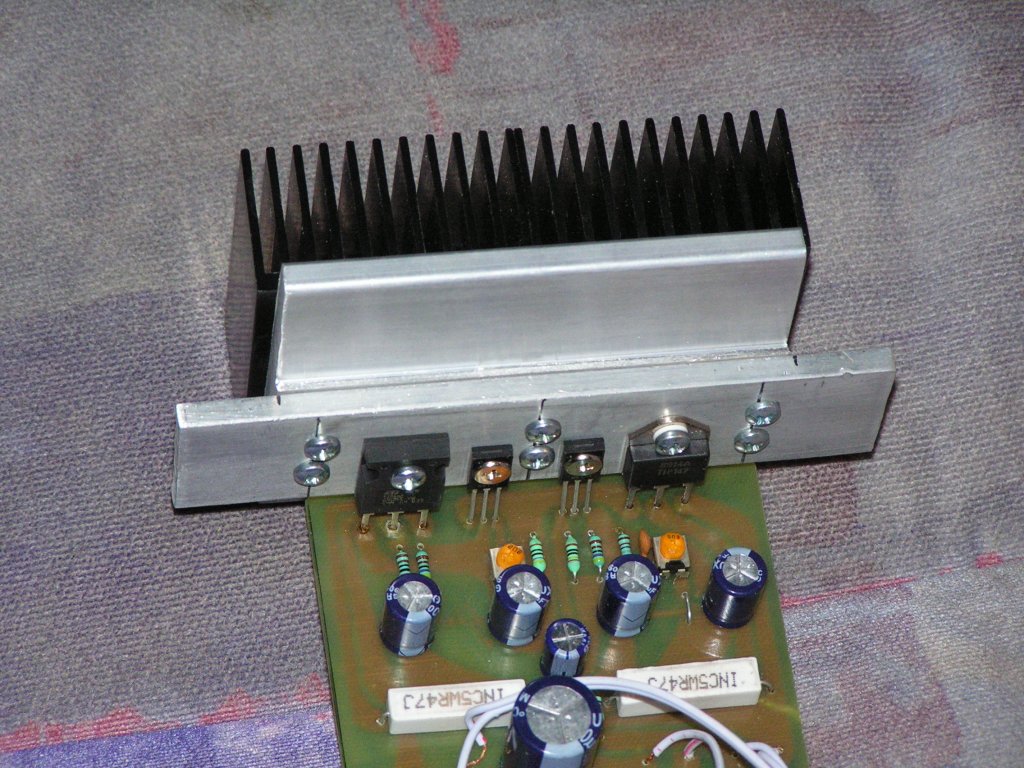 A teteje, az éleknél egy kevés ragasztóval van a kerámia substrat-ra ragasztva, viszonylag könnyen lepattintható egy csavarhúzó segítségével (szépen végig kell feszegetni, hogy mindenhol elengedje). Minden esetben a végtranyók szálltak el, hiszen semmilyen védelem nincs benne. Azért érdekes, hogy gyakorlatilag az összes elszállt, pedig biztos, hogy sokan úgy vigyáztak rá, mint a szemük fényére... A rossz tranyók (chip-ek) kivezetéseit elvágtam, és helyettük BD243 tranyók kerültek a kapcsolásba. A tranyók persze csak kívül fértek el, ezért a tok tetején (felső él, a normál kivezetésekkel pont szemben) fúrtam 6-12 db D=1,5mm furatot, és ezeken vezettem át a tranyóhoz menő vezetékeket. Így a tranyókat "külön" kellett a hűtőfelülethez csavarozni. Fényképet sajnos nem tudok mutatni róla.