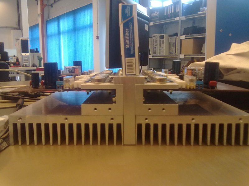 Én elég tisztes bordára tettem, nem is a hűtésétől félek, hanem ettől +-70V tápfesztől, ráadásul nem is fog nagyon leesni a fesz mert 800w 2x50V ac -s toridokat tekertettem hozzá 2őt