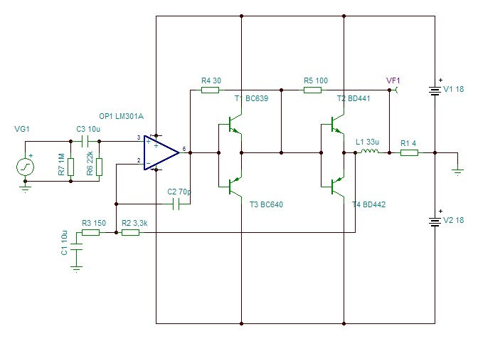 Ebben a topicban olyan erősítőkkel kellene foglalkozni, amelyek tiszta B- osztályban üzemelnek, azaz egyáltalán nem folyik a végfokozatokon nyugalmi áram. Sokak szerint ilyen kapcsolás technikával egyáltalán nem lehet kiváló hangú erősítőket építeni, hiszen a félvezetők kapcsolási feszültsége mindenképpen torzítást okoz, amit valamiféle módszerrel ki kell javítani. Kezdetnek én felteszek egy kapcsolást, amit még pár éve dolgoztam ki, egy kifejezettem meleg környezetben való működés számára + 120 C, ahol rendkívül fontos volt a hőmegfutás elkerülése. Sajnos semmiféle szokvány AB osztályú kapcsolás nem volt megbízható ebben a környezetben, ugyanakkor nagyon fontos volt a kis jelű linearitás és a jelentős kimeneti teljesítmény. Az alkalmazás nem hangtechnikai célú volt, de mint kiderült, jó eredménnyel lehetett használni erre a célra is. Ráadásul ezek a kapcsolások teljesen hidegen képesek működni és semmiféle beállítást nem igényelnek. Gyakorlatilag bármilyen félvezető készlettel hozza a paramétereket, csupán a határadatokra kell odafigyelni. A kapcsolás jellemzői igen jók, torzítása 10kHz-n 5mV és 500mV bemeneti jelnél is tizedszázalékos, ami jól mutatja, hogy a várttal ellentétben egyáltalán nem mutatkozik keresztezési torzítás. Nagy tápfeszültségű OPA-val, ami legalább 40 Mhz Fb-jű, 100W teljesítmény is könnyen elérhető megfelő tápfeszültség mellett. Frekvencia átvitele 20 Khz-n van korlátozva, ami nagyon jól hallgatható magas hangokat eredményez. Hasonló kapcsolásokat várok ide, ha nem is paraméterekre hegyezetteket.