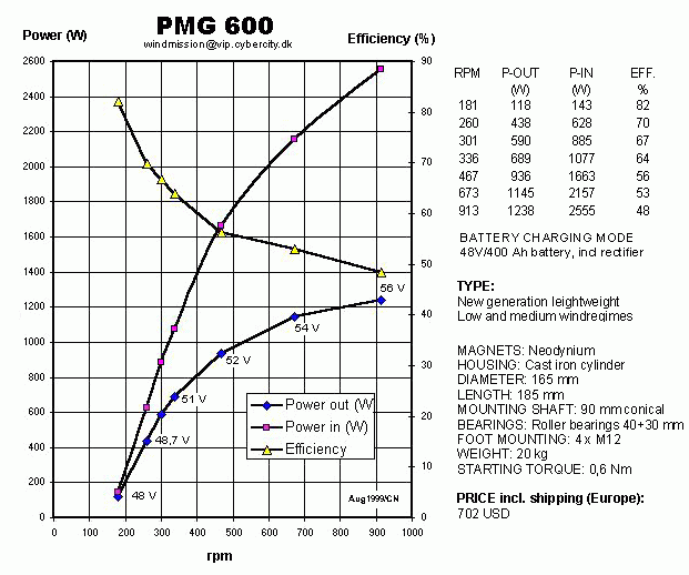 - Tehát nagyobb generátor fordulat (mindegy, hogy mitől) = nagyobb kivehető teljesítmény, kisebb fordulat (mindegy, hogy mitől) = kisebb kivehető teljesítmény, és fordítva is. Nem lineáris, de egyenes arányosság szerint. Ld.: mellékelt, tipikusnak tekinthető vasmagos PMG ford. függő karakterisztikáit (PMG600_karakt.gif).