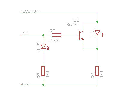 Pedig a kettős-LED-es megfejtés a legfrappánsabb, különálló LED-eknél szintén leírták a legjobbat, hogy az üzemi és a készenléti 5V közé kerül a LED. Az üzemi 5V-os ágon látott terhelés pár-pártíz Ohm kikapcsolva, így gond nélkül tud áram elfolyni arrafelé, a soros ellenállásra van szükség mindössze, ez két alkatrész. Felesleges tranzisztorral, relével, inverterrel bonyolódni, sem jobb, sem üzembiztosabb nem lesz ettől, csak több alkatrészt pocsékolunk egy egyszerű probléma egyszerű megoldására.