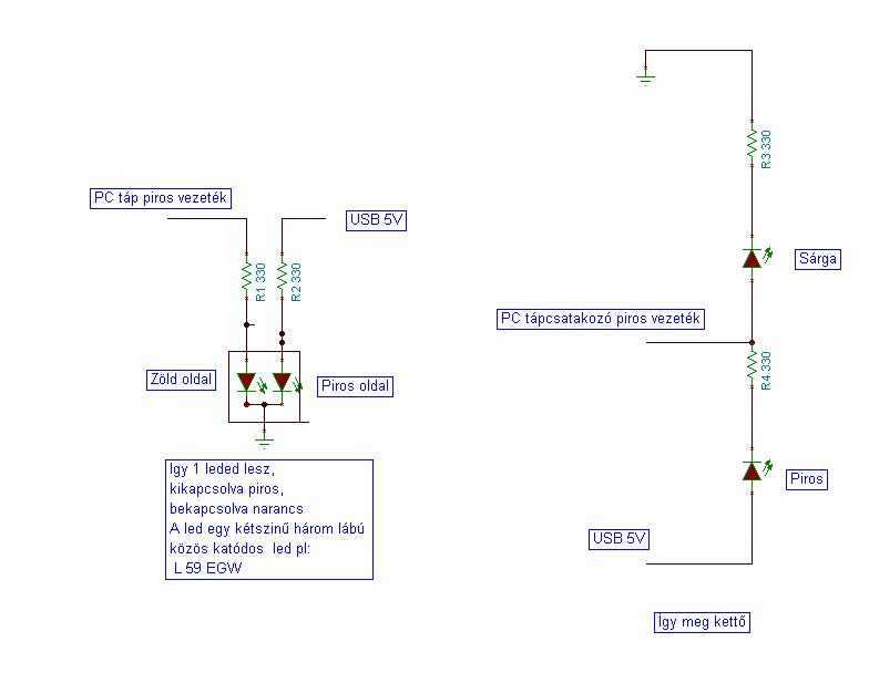 2 leddel akarom megoldani a dolgot. Mondjuk legyen piros és sárga! A bekapcsolás ugye nem probléma, mert az alaplapra rá lehet kötni egy led-et, ami bekapcsolt állapotba világít. Erre kötném a sárgát. De azt szeretném hogy kikapcsolt állapot egy másik led világítson, jelen esetben a piros! Ehhez tápot mondjuk egy usbről tudnék biztososítani neki!