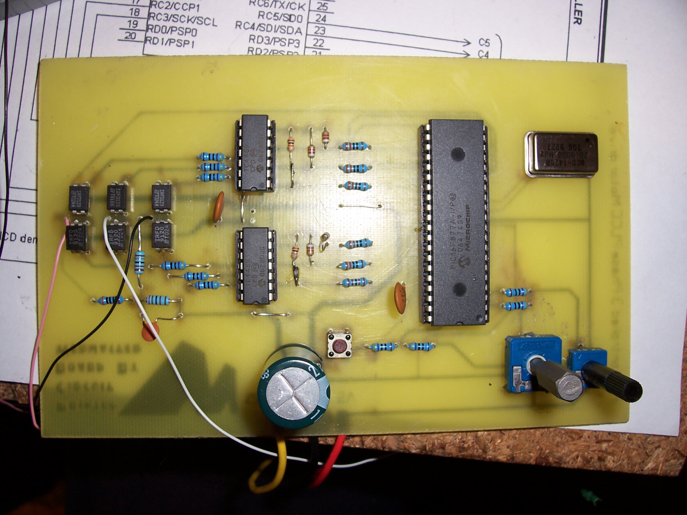 Örömmel jelentem be, hogy sikerült egy tökéletesen működő HDD motor vezérlő áramkört építenem. Használható szenzoros illetve nem szenzoros motoknál is. Nem szenzorosnál, kell egy külön fájlt generálni, ami a motor adatait tartalmazza, és ezek alapján állítja be a felpörgetés mértékét illetve a max fordulatszámot. Ehez van egy ügyes kis excel fájl. A szenzorosos megoldást nem próbáltam ki, mert nincs ilyen motorm, de ott nem kell külön fájl, mivel ott érzékeli a tengely pozícióját és abból számolja ki a sebességeket. A frekit és a kitöltéséi tényezőt egyeránt egy-egy potival lehet állítani. Még meg kell, hogy jegyezzem, hogy nagyon magas fordulatszámokat régebbi HDD motorral nem lehet elérni, egy idő után kijön a ritmusból, és csak rezeg a motor. Újabb HDD motrokkal már szépen megy. Például egy 80 gigás Segate HDD motorjával(3. kép) már szépen felpörgött, viszont egy régebbi Samsung (500MB) vinyó motorjával nem sokat értem el, vagyis csak nagyon lassan lehett pörgetni és elég hamar berezgett. (utolsó képen) A motorokat minenképpen hűtőbordára kell szerelni mert nagyon hamar felmelegednek teljes kit. tényezőnél, alacsonynál alíg... A másik, hogy a motoroknak elég kicsi a nyomatékuk, nem nagyon lehet terhelni őket. Ha pl kicsit lefogom akkor már leáll a motor és csak rezeg, majd a PIC újból elindítja. Még valami érdekeset észrevettem, méghozzá azt, hogy ha a motor működése közben a pákát ki/be kapcsolgatom, a motor megáll, majd újraindul, talán valami zavart kelthet, nem tudom... Képeket, videókat és kapcsolási rajzokat mellékelem. Az első három képen egy újabb, az utolsón pedig egy régebbi winyóból származó motor tesztelése látható. Videó: Kis felbontásban Nagy felbontásban A videón egy újabb segate winyó motorja lett felpörgetve.