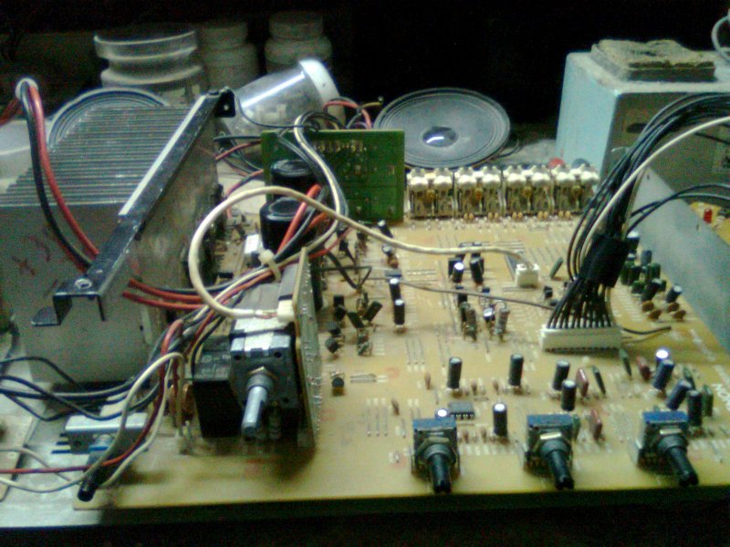 Segítséget szeretnék kérni, egy régi sharp erősítővel kapcsolatban. A típusa sharp sa-107 Ez egy hifierősítő, ami kb 30 éves. Ennek ellenére szép hangja van és kb 2*50W-ot tud. Az erősítő felépítéséről nem igazán tudok sokat elárulni, mert nem bontottam szét teljesen, viszont ötleteket várnék a későbbiekben említett probléma forrására. az erősítő tartalmaz egy rádió funkciót is, ami a problémát okozza, illetve a sztereó erősítő panelt. A PROBLÉMA: Az erősítő bekapcsolásakor, a lehetséges bemenetek közül(CD és AUX névre hallgatnak)egyikre beérkező jelet sem továbbítja a kimenetre, megfelelő működés mellett a rádió funkció lép életbe bekapcsoláskor. ezután egy mikrokapcsolóval (AUX) lehet átkapcsolni a bemenetre, ezt követően az erősítő AUX funkcióban kellene maradjon. Egy kétállású kapcsolóval lehet váltani a CD és az AUX bemenet között. Jelenleg az erősítő nem így működik : Bekapcsoláskor a rádió funkció lép életbe. Ezt követően váltok AUX-ra. ez meg is történik. A rádió és aux funkciónak is van egy visszajelző LED-je aminek értelem szerűen egyszerre nem szabad(na) világítania. Ennek ellenére megteszi.Régen nem tette. A működés közben teljesen rendszertelen ütemben visszalép rádió funkcióra. Sem melegedéssel sem egyéb problémával nem sikerült kapcsolatot felfedeznem az átkapcsolások ütemében. Röviden tömören: Az erősítő működik és szól is. AUX funkción a bemeneti jelet erősíti, tökéletesen de később átlép rádióba. nem tudom mi okozhatja, de gondolom Valahonnan olyan impulzust kap ami a vezérlő IC-t aktiválja. Viszont arra sem sikerült rájönnöm, hogy melyik végzi ezt a funkciót. Ha láttatok már hasonló problémát vagy van ötletetek, hogy merre keressek, esetleg valamilyen anyagotok van az erősítőről, légyszi írjatok, mert én nem találtam róla semmit.