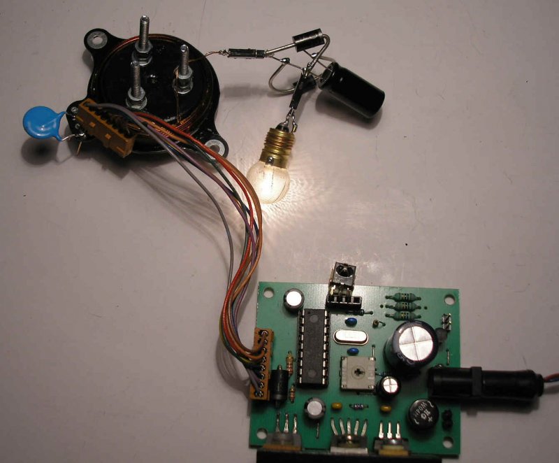 - Úgy néz ki, ezekkel a kis átalakítási műveletekkel igencsak megnőtt a jósága a forgótrafó átvitelének. Ha szükség lenne rá, jóval nagyobb áramok is átvihetők a jelzett módosításokkal. Egyébként, kisebb lehet a kitöltés, és kevesebb a bemenő áram is. A tekercsek adatai: 100 menet 0.5mm-es CuZ huzalból, a szekunder 150 menet 0.35mm-es CuZ huzalból készült. A terhelés 6V/0.8A-es izzó, (cca 5W), az egyenirányítás után a puffere lett rákötve. Néhány képben a kísérleti összeállításról.