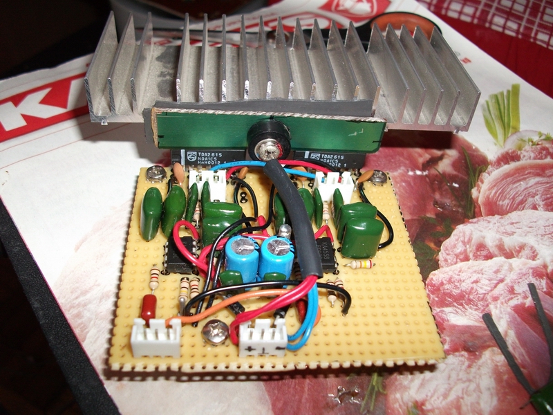 Elkészült a "Low-cost amplifier project"-em első részlete. Magyarán szólva, "építs erősítőt abból amit találsz a fiókban".A végfokozat 2db TDA2615-ös IC-ből áll. Ezek szolgáltatnak együttesen 2 x 12Wattot. A bemeneti fázisfordítást 2db KA4558 -as IC teljesíti. Az erősítőt magát próbapanelra építettem meg. Hűtőbordát egy Sony PS2-ből bányásztam ki. Ami nekem ebben a kütyüben pénzbe került, az 2db 220nF-os kondenzátor. Tesztelegetéssel és építgetéssel ráment kb. 2 napom összesen. Íme néhány kép róla. Az üzemkész állapotról később teszek fel még 4 fotót. A fázisfordítós ötletért köszönettel tartozom Hatala Istvánnak.