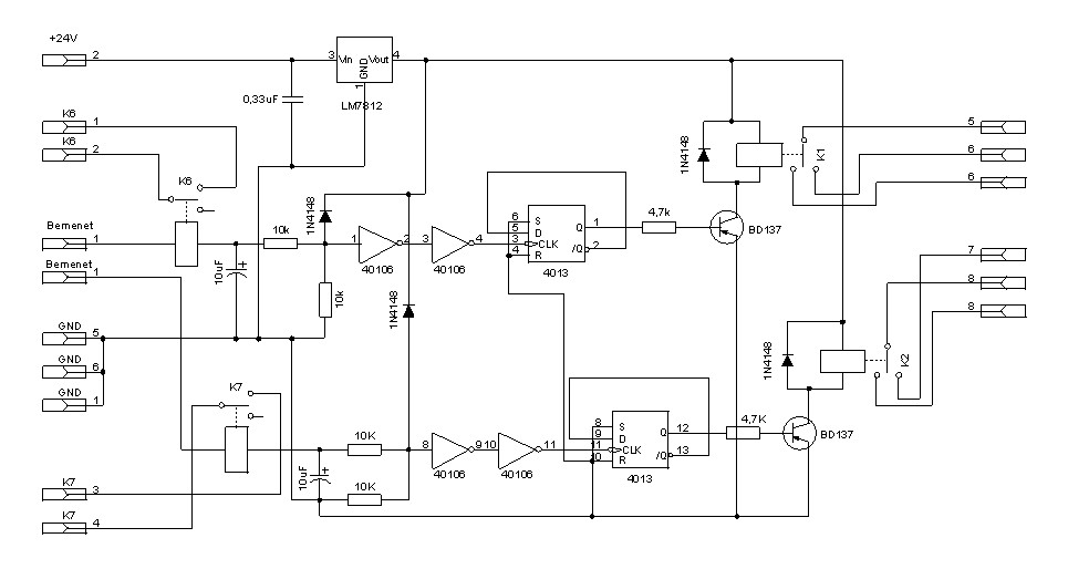 Mint már írtam meg látható is ez két bistabil kapcsoló lenne egybegyúrva, kimenetükön relét vezérelnek, meg a bemeneti jelüket is a relé kapcsolja, ahogy tanácsoltad.