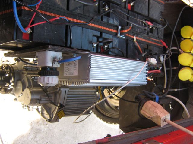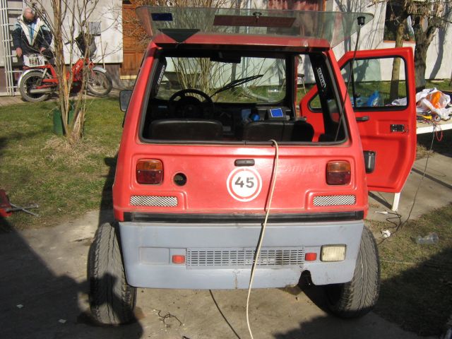 1,5 Kw-os motor difivel, kontroller, elektromos gázpedál, 2 töltő, 10 aksi, fotómű, két alufelni motor gumival. A járgány még nincs teljesen kész, a festés, +1 ajtózár szerelés, meg a 220v-os töltőkábel kivezetés még hátra van, de működik a járgány. Az első teszteken túl vagyok. Kipróbáltuk a gépet, a GPS szerint 36km/h megy, de nem nagyon akartam nyomni, mert bejáratós. A hatótávot még nem tudom, ameddig nem volt sárvédő nem mertem elindulni. A számítások szerint kb 60 km. Gyorsulás, megy mint a golyó, fokozatmentesen, messze veri az eredeti piaggio 125 motort. Tehát van egy fékem, meg egy gázom, ja meg az irányváltó kézi karját átalakítottuk egy plusz milteszkapcsolóval, ami most a controllerbe váltja az irányt. Hangja: -érdekes, kicsit dodgemes, de az utastérben végre lehet beszélni. Sokan nem tudták elképzelni, hogy egy 1,5 kw-os motor hogy hajtja meg az autót, ki lehet próbálni, a vártnál jobb, nekem ez a sebesség elég, ugyse lehet vele 45-nél többel menni, és az alkatrészek sem koptak össze. 2 személyre elég. a számítások szerint így 100 km 200 ft-ba kerül, a lagunámmal ugyanez 3600 Ft. A kinaiakat kérdeztem, hogy ne-e inkább nagyobb motort rendeltek, de még így is hülyének néztek, mert 48v , 1,2kw-os rendszert ajánlottak, mert nálluk ezek a kisebb motorok is 700 kg-os triciklít hajtanak. Szóval képek a már lábon álló gépről: