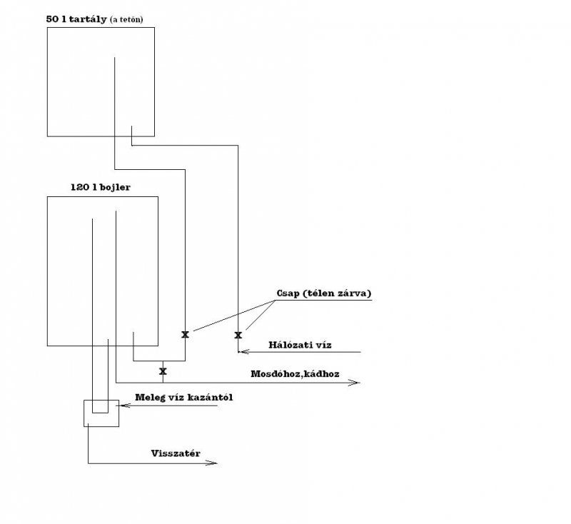 Itt egy kis félre értés van.Télen az 50 literes tartály (ami tetőn lesz fekete színben) kiürítésre és lezárásra kerül.Télre én a fűtés rendszeréből akarok egy kis hőt átrakni egy hőcserélőn keresztül a 120 literes bojlerbe.Szóval legkésőbb október közepén az 50 literes tartály ki lesz ürítve.Már a tervek meg vannak a fejemben hogy mit hova kell tenni.Most már csak a mosógép van függőben.De a munkaidőm mostanság nem nagyon engedi a kísérletezést.
