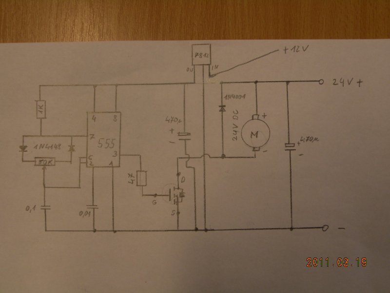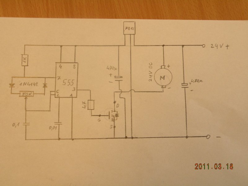 Még jobb is lenne, ha külön tudnád választani a vezérlés, és a teljesítményrész tápellátását. Egyébként a stabkockának még a 24V nem árt, (ha valóban annyi), de azt figyelembe kell venni, hogy a 24V-12V különbségét az 555 felvett áramával megszorozva hő formájában adja le. Hűtés nélkül bizony melegszik... Hiányolom a stabkocka be-test-ki lábai közül a minimum 100nF kerámiakondikat (gerjedésgátló szerepük van) és a motorral párhuzamos szabadonfutó diódát.