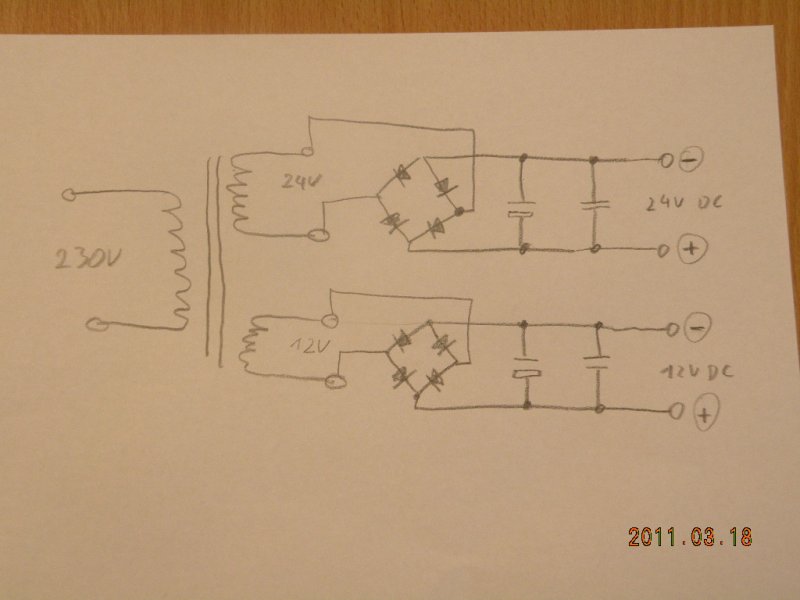Itt küldöm a skiccet a tápról . A diódák 3 A-osak,az elko 1000mik. a kondi 100 nanos.