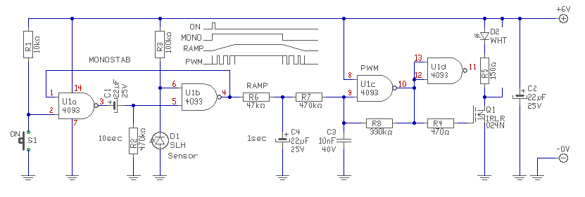 Feszültség 5v a fotó ellenállás fényre csökkenti az ellenállását. PWM helyet én inkább a kimenetre akakrtam tenni mondjuk valami 2n2222 egy kondival kondit feltölti felvilágosodik majd kisüti és lassan elalszik. Gondoltam én... bár fettel is megoldható lenne szerintem. Nagyon köszönöm a segítséget.